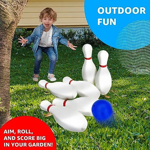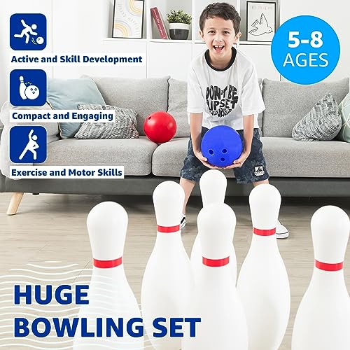 • Oversized bowling set designed for kids aged 5-8.